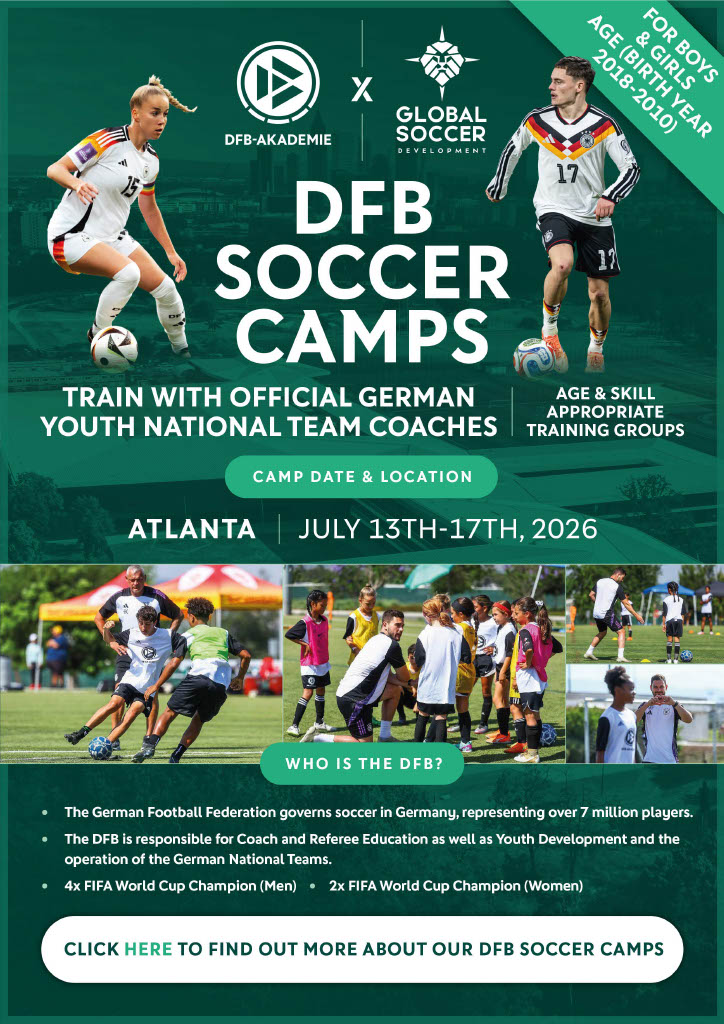 This summer, elite coaches from the German Football Federation (DFB), the powerhouse behind Germany’s four FIFA World Cup titles, are coming to America. The Elite German Soccer Camp Series, hosted by Global Soccer Development (GSD), offers a rare opportunity for dedicated youth players (born 2010-2018) to train under official DFB-certified coaches using advanced European training methods.